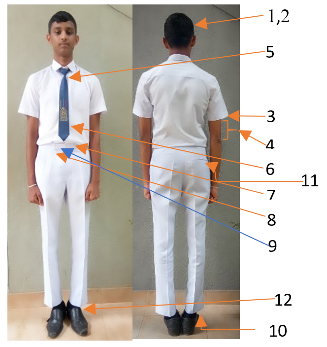 - පාසලට ගැලපෙන සුදු සපත්තු හා සුදු මේස් පැළඳිය යුතුය.